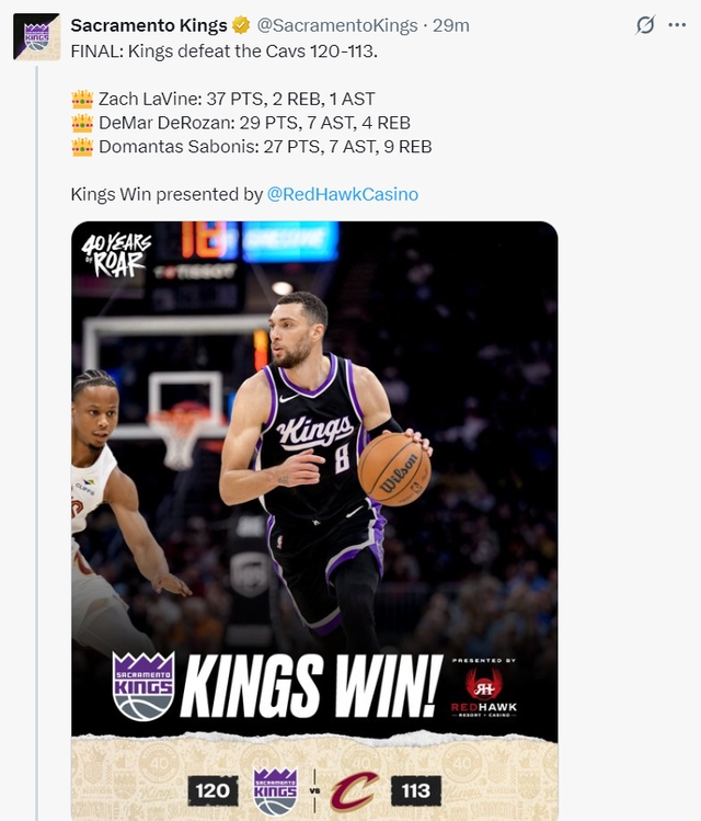 最让人意外的还是国王队。谁能想到,赛季初还在西部下游晃荡的国王,最近突然爆发,先是击败东部第一的骑士,再拿两连胜,直接升到西部第九。德罗赞、拉文、小萨博尼斯这仨巨头太猛了,一场比赛合砍 92 分,跟商量好了似的,你砍 30 我砍 30,把对手防线撕得稀碎。国王这波逆袭,就像班里的中等生突然发力,不仅追上了前面的同学,还反超了几个,看得人热血沸腾。现在国王离附加赛资格只差一步,后面还有机会冲一冲,说不定真能当回 “黑马”。