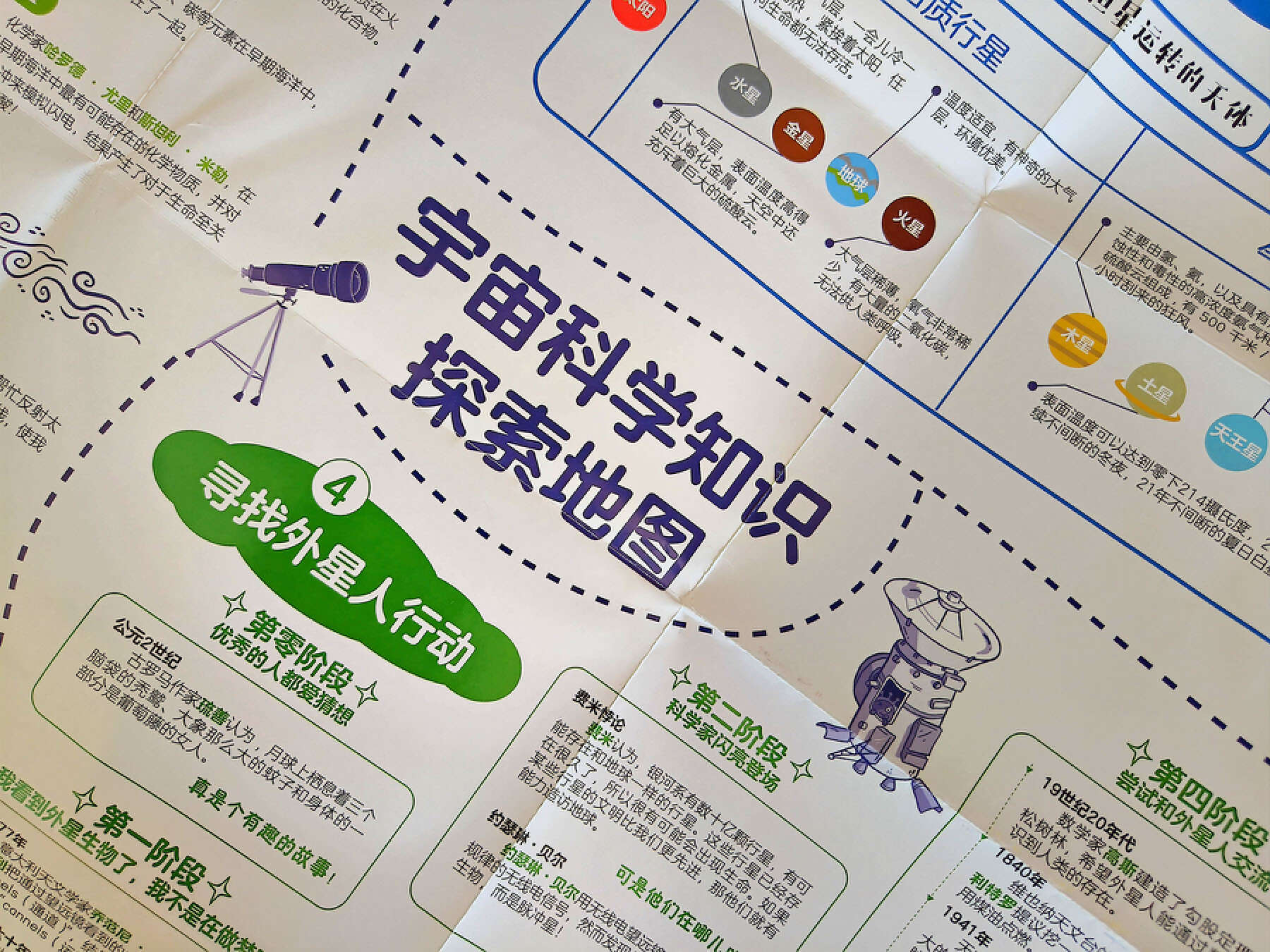 在拿起书的时候,还看到了书中夹有一张《宇宙科学只是探索地图》,有这张探索地图展开后是非常大的,讲述了人类在不同时期内探索宇宙科学所作出的努力。
