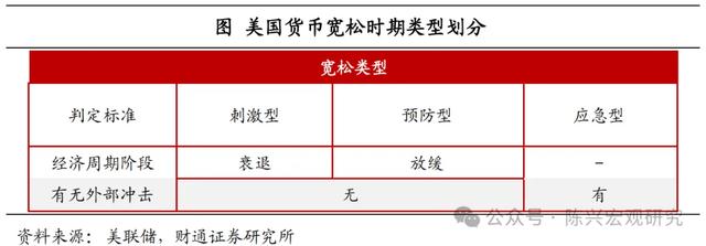 针对不同经济背景,货币宽松主要分为预防型、刺激型和应急型三种。在美国经历的10轮完整的货币宽松周期中,我们根据当期美国是否有经济危机以及货币宽松期所处的经济周期阶段,对其进行分类,主要包括应急型、刺激型与预防型三类宽松模式。其分类标准与分类结果如下: