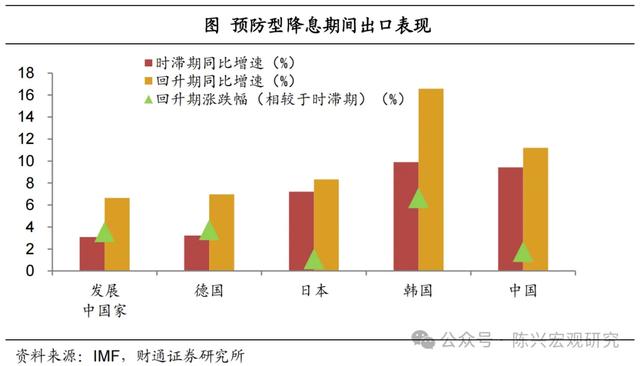 总体来看,预防型降息发生在经济放缓时期,降息幅度较小,出口平稳回升。由于经济整体仍处于较高运行状态,降息对经济和贸易的支撑作用明显,时滞期接近一年。而在预防型降息对应时期,发展中国家多受经济危机拖累,导致发达国家表现相对较好,中韩受国内政策激励表现亮眼。品类中,电子、基础化工和交运行业表现突出,农产品与纺服较为疲软,发展中国家钢铁和机械表现较为突出。