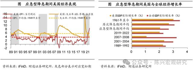 经济受到严重破坏,降息幅度大且快。由于危机对经济的破坏程度剧烈,对应的刺激措施力度也较大,往往一降到底。随着经济全球化进程的日益推进,经济危机爆发后的波及范围、持续时间和破坏性逐渐增大,后两次经济危机对美国GDP增速和失业率的影响幅度高于前两次。