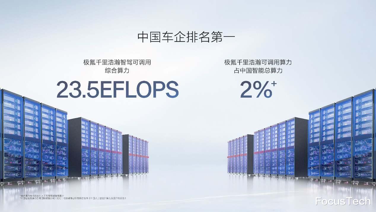 发展智能驾驶,用于智驾大模型训练的超级计算中心至关重要。极氪在千里浩瀚全面整合前,以仅占行业头部十分之一的算力规模,实现了城市无图NZP、车位到车位等高阶智驾功能落地。借助“吉利智驾一盘棋”的巨大优势,极氪千里浩瀚可调用算力实现了近30倍的跨越式增长。极氪千里浩瀚智驾目前可调用算力,达到了23.5 EFLOPS,在所有中国车企中,排名第一,达到中国智能总算力的2%以上。算力储备每提升1 EFLOPS,其智驾大模型在每个迭代周期内,可多学习近10万个场景数据,高阶智驾功能将实现更加快速的迭代。