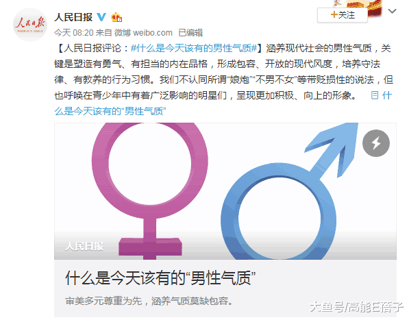 #新华社批娘炮风#今天,新华网刊文称,由嫩到美进而娘,这种病态审美的递进耐人寻味。它是颜值消费和眼球经济跑偏的结果,更是文娱圈子奢靡浮夸之风新变种。“娘炮”现象之所以引发公众反感,是因为这种病态文化对青少年的负面影响不可低估。 为此,人民日报给出了不一样的看法,人民日报发文表示,涵养现代社会的男性气质,关键是塑造有勇气、有担当的内在品格,形成包容、开放的现代风度,培养守法律、有教养的行为习惯。不认同所谓“娘炮”“不男不女”等带贬损性的说法,不认同“娘炮”“不男不女”等带贬损性说法,但也呼唤在青少年中有广泛影响的明星们,呈现更加积极、向上的形象。 话说回来,其实一个男人是不是真正的男子汉,不光看外表,更重要的是行为作风。做事有担当,认真负责,关键时候能站出来保护家人,才是真男人。