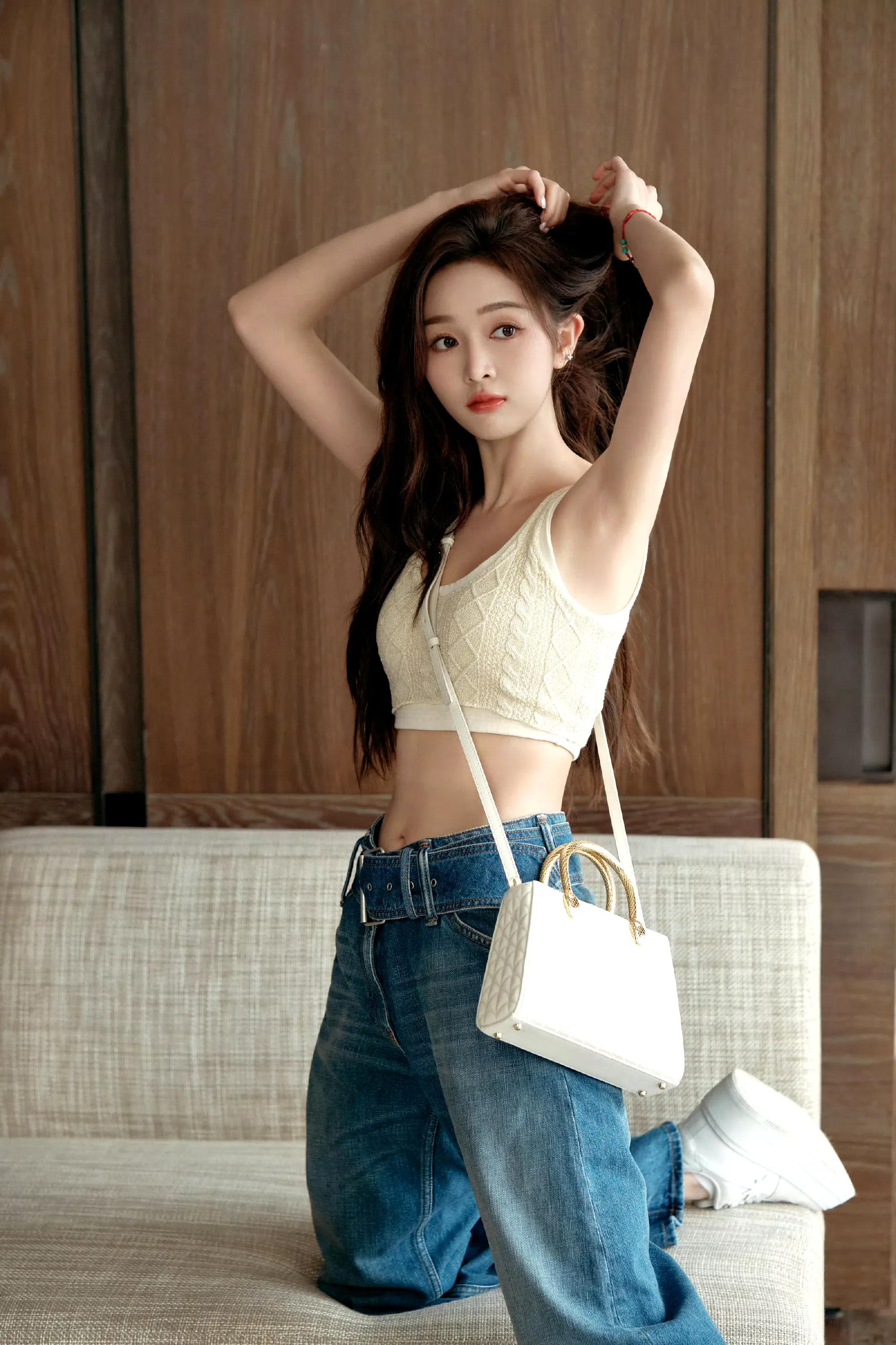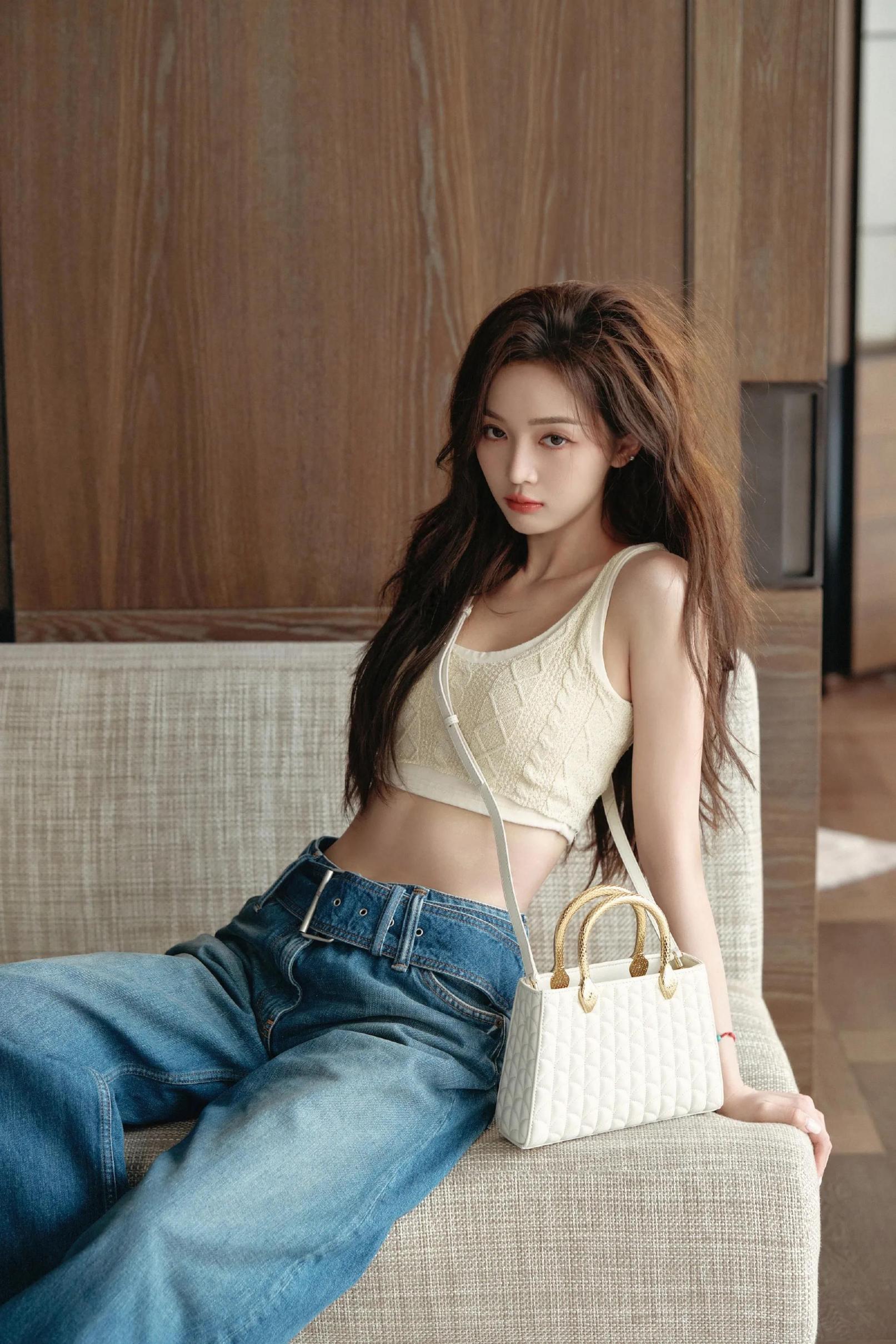 吴宣仪这组造型的巧妙之处,在于单品的选择与搭配:短款针织背心强调腰线,阔腿牛仔裤藏肉又显腿长,白色手提包提升整体精致度。无论是日常出街还是拍照打卡,这样的搭配都能兼顾舒适与时尚。而她在镜头前的姿态管理更值得学习 —— 松弛的肢体语言、自然的表情,让时尚大片多了一份 “生动的故事感”。