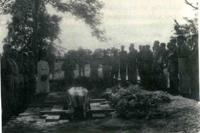 (上图)训练中意外死亡的志愿队飞行员阿姆斯壮的葬礼。中间念悼词者为志愿队随军牧师佛莱曼,左侧着浅色衣服者为协助葬礼进行的当地英国牧师。