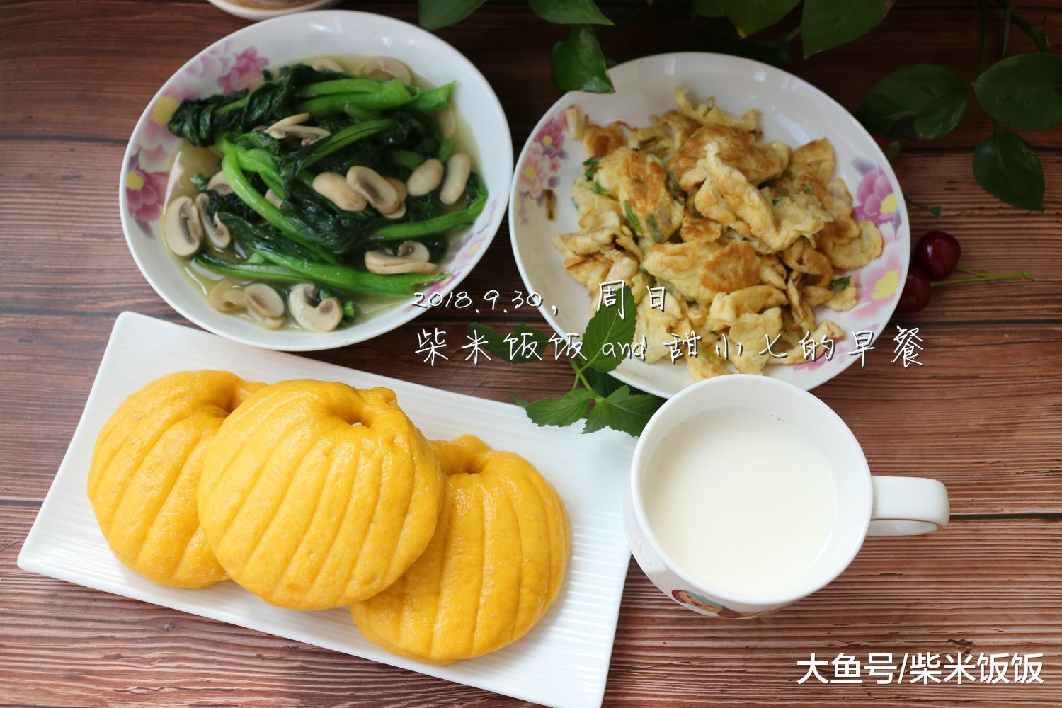 【柴米饭饭 and 甜小七的早餐日记】2018.9.30,星期天。今日早餐有:金色贝壳馒头、牛奶、口蘑炒菜心、小葱炒鸡蛋。今天周末却依旧是工作日,但是今天的早餐很好做。金色贝壳馒头是昨天晚上蒸好的,今早蒸锅里热一下就可以了,甜甜的,软软的非常好吃,我今天会出制作教程,大家到我主页里去看。吃馒头肯定要有菜,今早炒了口蘑炒菜心和小葱炒鸡蛋,两道都是快手菜,每人一杯牛奶,20分钟搞定早餐。