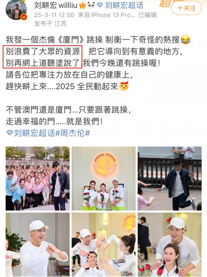 没想到今年又开始传谣了,可能是觉得谣言太离谱,所以周杰伦的好友刘畊宏也是第一时间站出来力挺好友,喊话大家别再道听途说了,还晒出了周杰伦在厦门跳操的照片,刘畊宏希望各位把专注力放在自己的健康上,别让这些莫须有的谣言占用了资源。