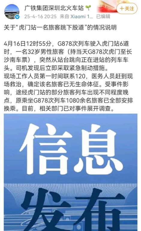 原文登载于中国基建报2025年04月16日关于一男性旅客在东莞虎门站跳下轨道身亡,部分列车出现不同程度晚点的报道