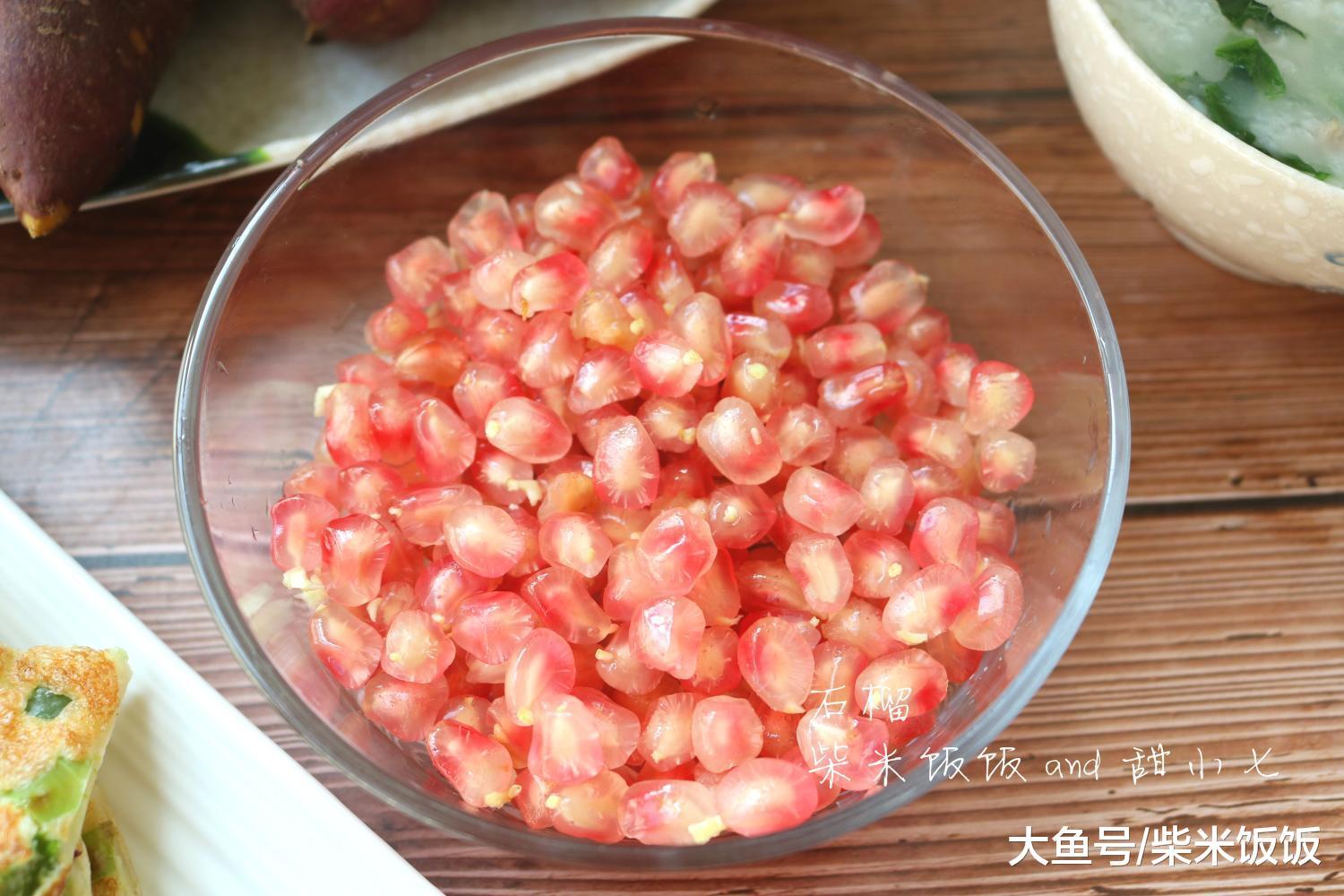 【柴米饭饭 and 甜小七的早餐日记】2018.10.15,星期一。今日早餐有:青椒鸡蛋饼、青菜瘦肉粥、蒸红薯&芋头、石榴。今天也全是快手早餐,早上起床后首先把红薯和芋头洗净放入蒸锅,大火蒸起来。然后把电饭煲预约煮好的白粥再次烧开后加入腌制好的肉丁,待肉丁熟了加入青菜碎,煮开后青菜瘦肉粥就做好了。然后和面糊做了青椒鸡蛋饼,香喷喷很好吃。鸡蛋饼做好,红薯和芋头也蒸熟,早餐搞定!