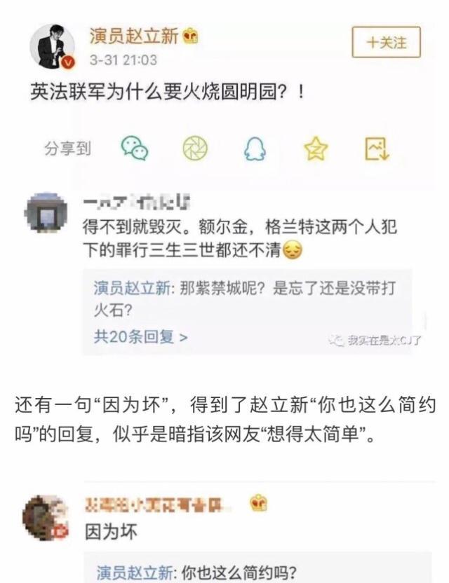 当年3月13日当天,赵立新在他的个人社交平台上发布了一条微博,表示“英法联军为什么要火烧圆明园”。