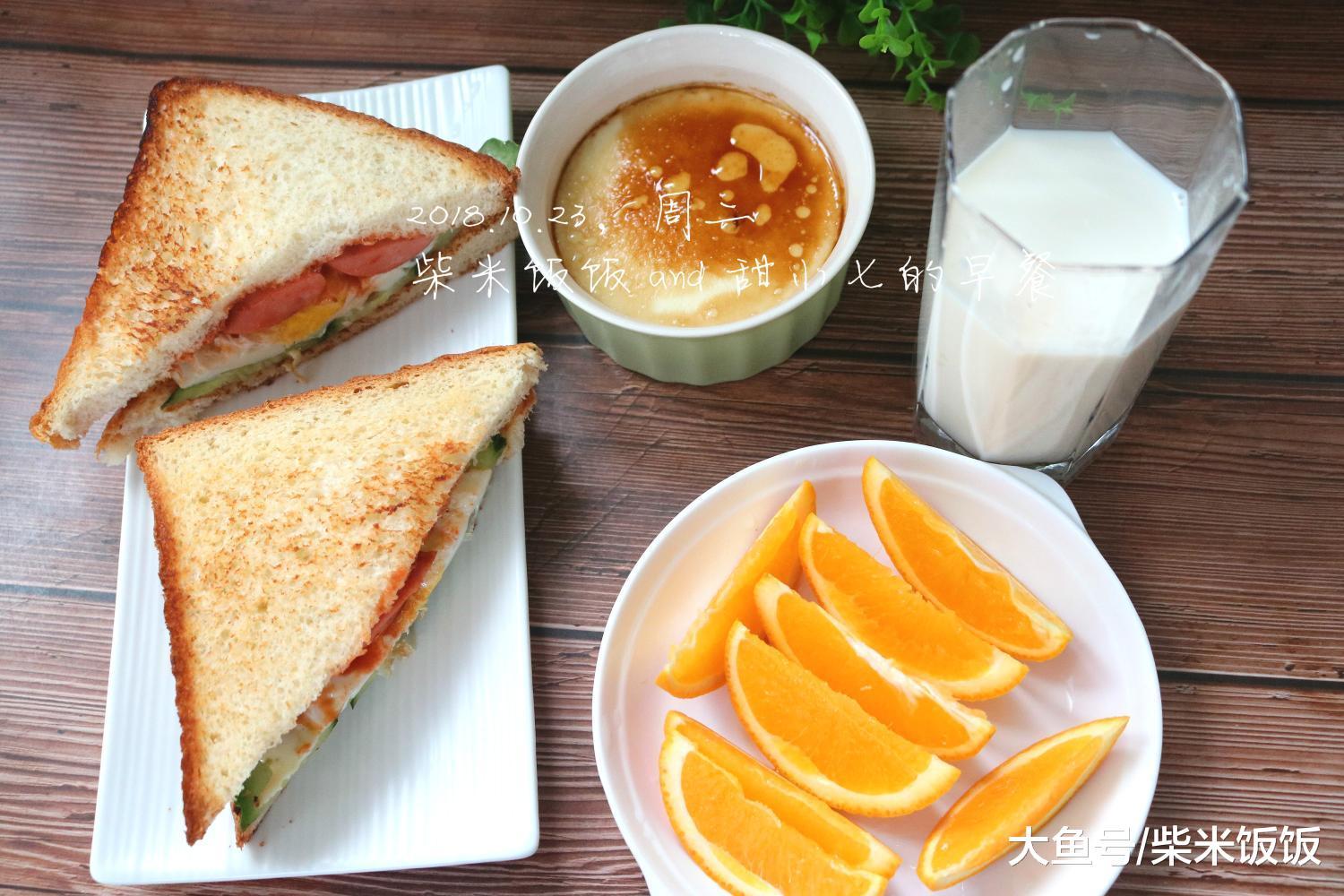2018.10.23,星期二。今日早餐有:三明治、蒸蛋、牛奶、橙子。今天的早餐特别省事,首先把蒸蛋蒸上,蒸了3小碗,每人一份。前天做的土司还剩了很多,今早放在电饼铛内烙一烙,特别香。里面抹上番茄酱,又夹了火腿、荷包蛋、黄瓜片做成三明治。另外每人一杯牛奶,再吃两块橙子。简单的早餐,满满的幸福感