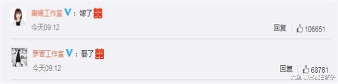唐嫣和罗晋结婚,连工作室也来秀甜蜜了~唐嫣罗晋晒出结婚照后,俩人的工作室分别表示:嫁了;娶了! 这个月娱乐圈真的是好事不断呀!