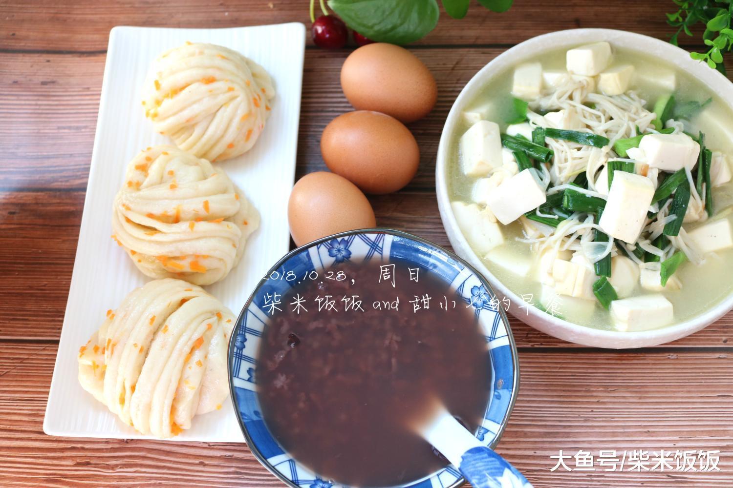 【柴米饭饭 and 甜小七的早餐日记】2018.10.28,星期天。今日早餐有:胡萝卜花卷、白煮鸡蛋、八宝粥、金针菇烧豆腐。周末早晨时间比较充裕,早上起床后现和面做的胡萝卜花卷,小清新味道,小七吃了整整一个。八宝粥电饭煲预约的,不用操心。金针菇烧豆腐,味道不错,出锅前再撒一把蒜苗,鲜味十足。