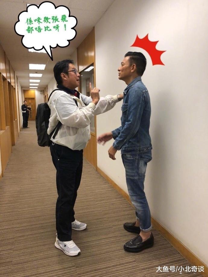 谭咏麟晒出与刘德华互动照片,他在走廊里拦住华仔不让他走,还壁咚刘德华,场面十分搞笑,随后还法感慨:别走,壁咚我一下。