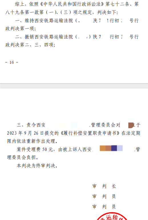 案件结果2024年12月25日,西安铁路运输中级法院经审理作出(2024)陕71行终1629号《行政判决书》,认定xx管委会未能准确认定上诉人是否符合宅基地申请政策,终审判决维持一审法院撤销《答复书》的判项,撤销一审法院直接裁判具体安置面积和金额的第二、三、四判项,责令xx开发区管理委员会对周女士于2023年9月提交的《履行补偿安置职责申请书》在法定期限内重新作出处理。