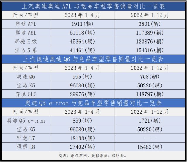 乘联会公布的数据显示,上汽奥迪在2022年全年共计销售仅6280辆,还赶不上一些竞争对手一款车型的销量。其首款车型奥迪A7L在2022年共计销售3801辆,而作为同级竞品的一汽奥迪A6L和北京奔驰E级分别共计销售约11.8万辆和12.4万辆。而顶着奥迪旗下史上最大尺寸SUV光环的上汽奥迪Q6,去年销量只有可怜的758辆,作为同级竞品的北京奔驰GLC共计销售了约14.88万辆,零头都是Q6的十倍多。奥迪Q5 e-tron在去年销量只有1721辆,与它售价相当的造车新势力理想L8则卖出了15482辆。