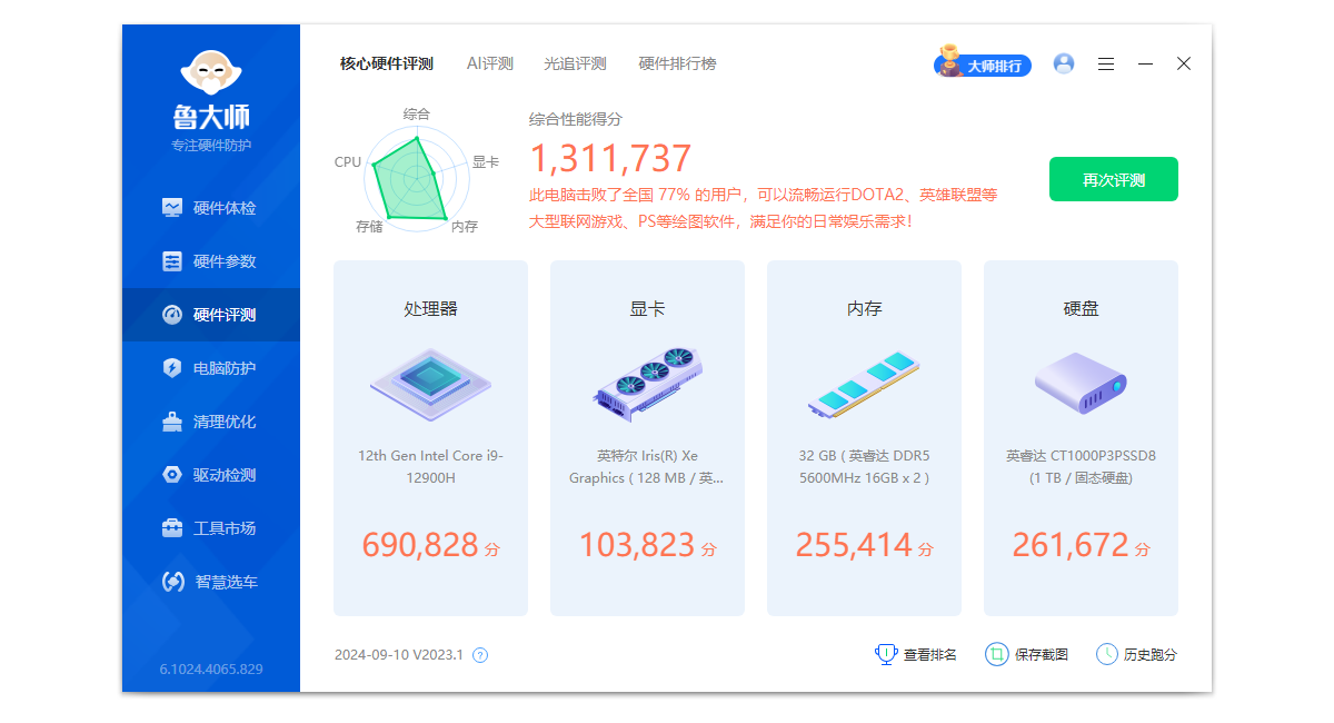 调用鲁大师硬件跑分,零刻GTi12 UItra的综合性能得分为131W分(处理器690828分,显卡103823分,内存255414分,硬盘261672分)。核显的分值表现在我的预料中,但用于应对日常的轻娱乐也足够。