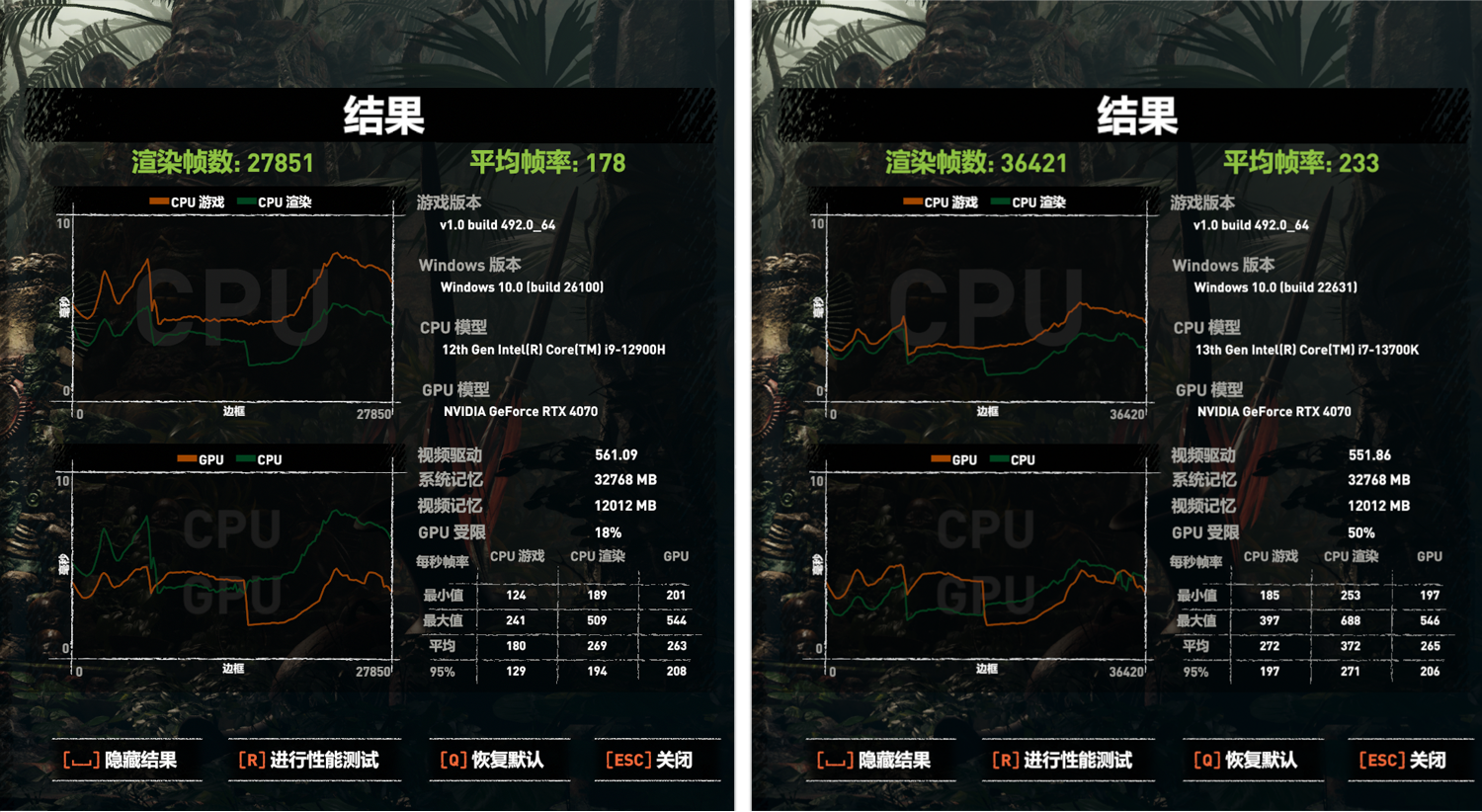打开游戏《暗影》,画质调至最高,在1920x1080分辨率下,这套组合(左图)的最终渲染分数为27851,平均帧率178帧;对比台式机(右图)上的分值,差距有些明显。这是因为台式机用的是酷睿i7-13700K处理器,输在了CPU渲染值上。