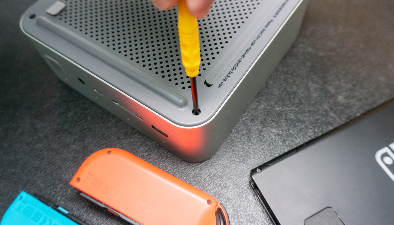 零刻GTi12 UItra的拆机位在底部,需要撬开堵塞的胶塞才能露出螺丝位。然后依次拧下四颗螺丝后,再拉动一旁的灰色提手,即可顺利开启底盖。
