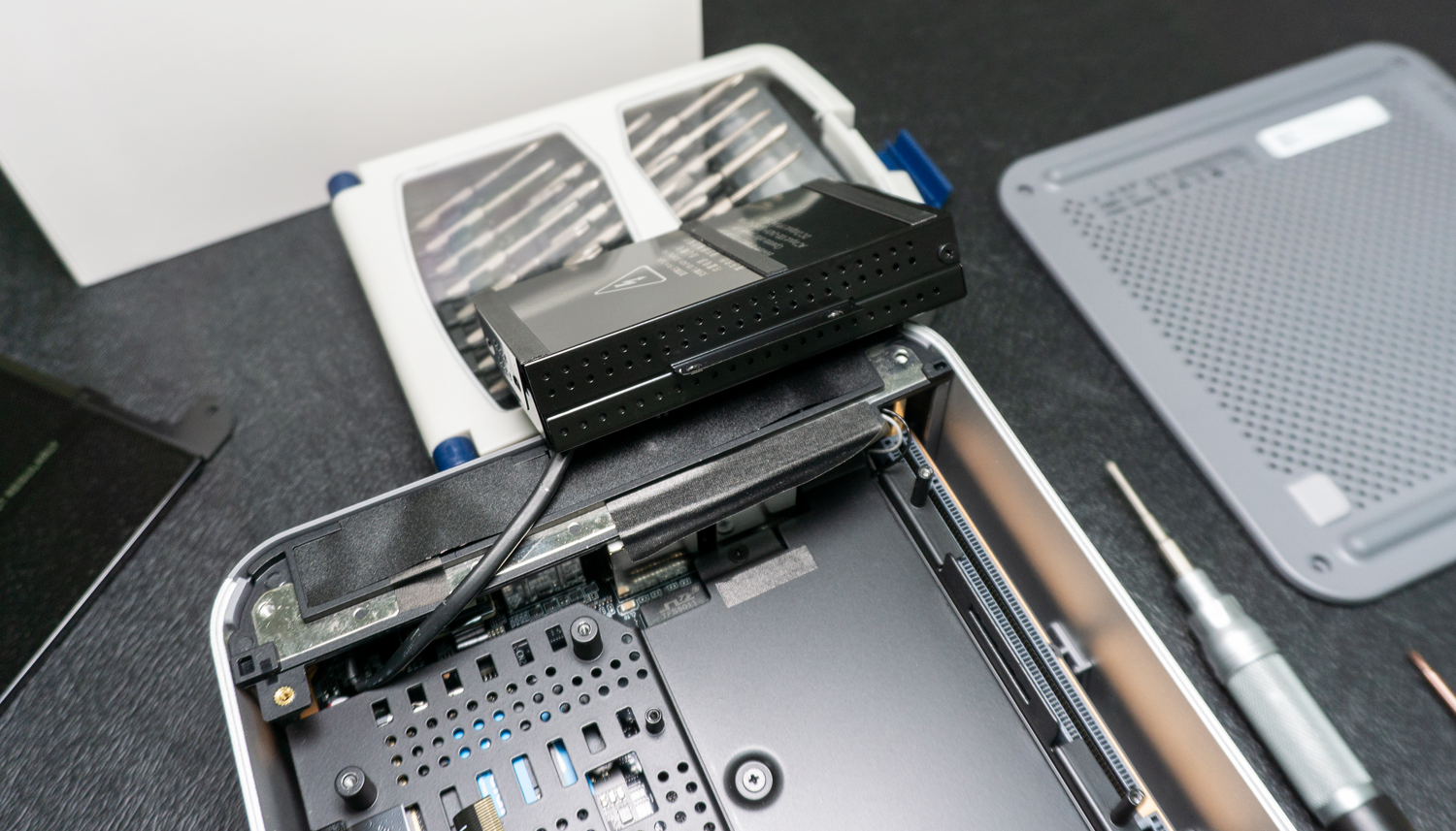 接下来将迷你主机的PCIe接口对准扩展坞上的PCB金手指插入,并装上侧面的挡片,确保稳固。