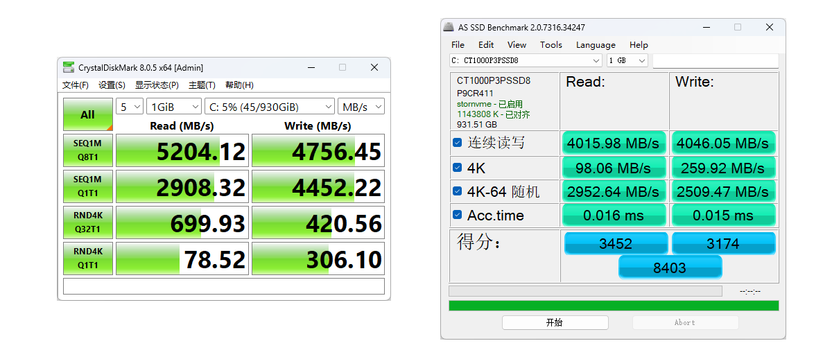 使用CrystalDiskMark测试,其速度为5204MB/s读取,4756MB/s写入;而在AS SSD Benchmark中,连续读取为4015MB,写入4046MB/s。由于AS SSD Benchmark会将CPU等综合性能也加入测试,因此成绩有所下降也在意料之中。