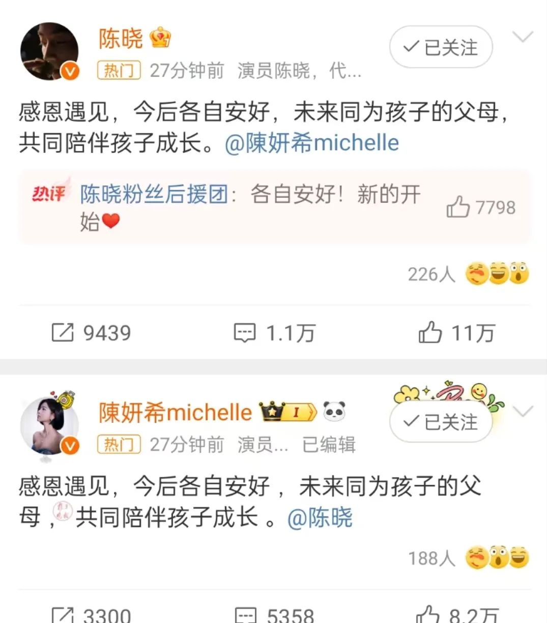 刚才陈晓陈妍希官宣离婚,也是预料之中,这是去年推文大家回一下。