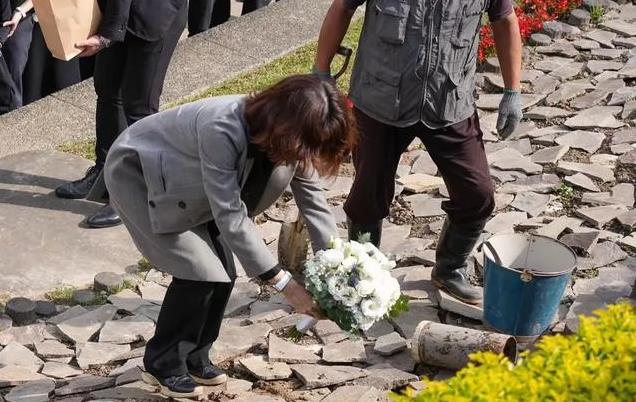 只见陈中维将母亲的骨灰从盒中取出,轻轻地撒在事先挖好的花坛中,儿媳何琇琼为婆婆献上鲜花,哭得泣不成声。