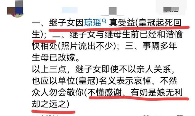 “人死为大,事隔多年生母已改嫁,继子女即使不以亲人关系,也应以单位(皇冠)名义表示哀悼,平家三子女格局太小!”