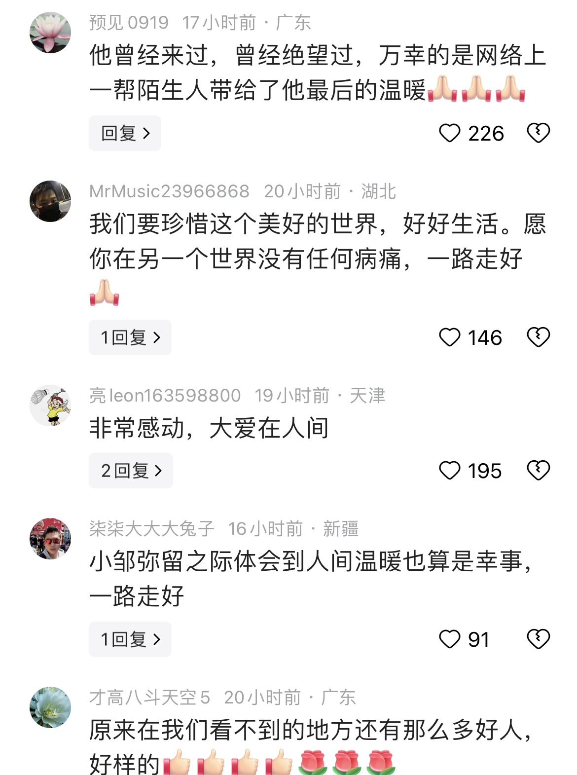 然而,即便得到了这么多的帮助,邹诚俊的病情依旧让人揪心不已。他经历了好几次手术,可身体却始终没有好转的迹象。8 月份,他又因重症胰腺炎再次住进了医院,病情愈发严重。即便在这样的情况下,他还在视频里真诚地感谢大家。直到生命的最后一刻,他还在担心自己会给大家添麻烦。