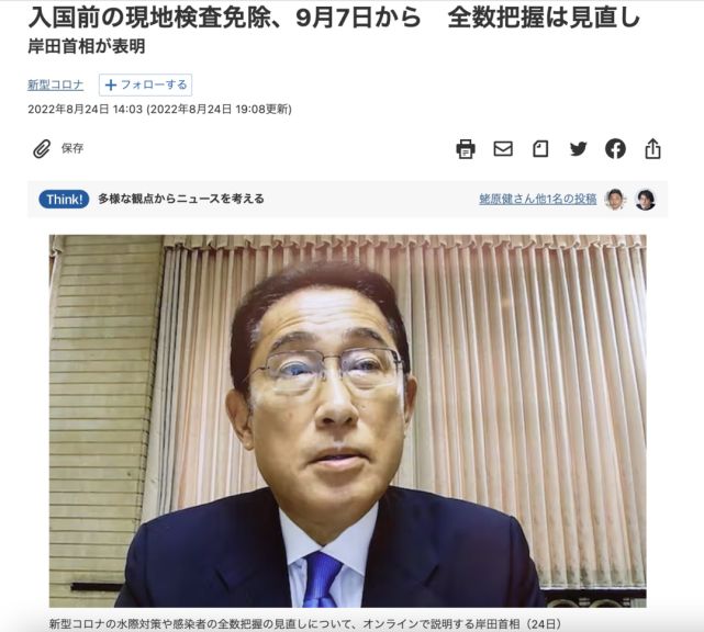 就入境政策,岸田文雄表示:从9月7日开始,提供三针新冠疫苗接种证明的入境者不再需要提供入境前72小时核酸阴性报告。