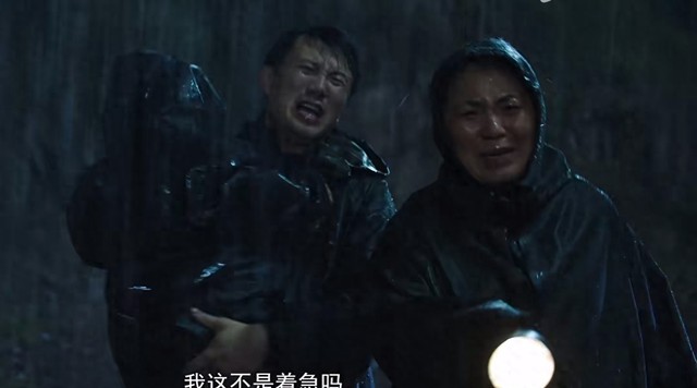 身穿黑色雨衣,装裹严实的夫妻俩,抱着发烧的女儿,在悬崖边上疾行奔走着,着急慌乱的步伐在雨夜的环境衬托下,显得格外紧张。