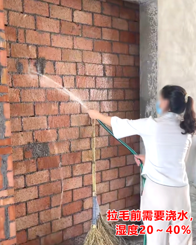 “拉毛”前一天,清理基层表面的尘土、污垢和油渍等,并用软管顺强至上而下洒水湿润。