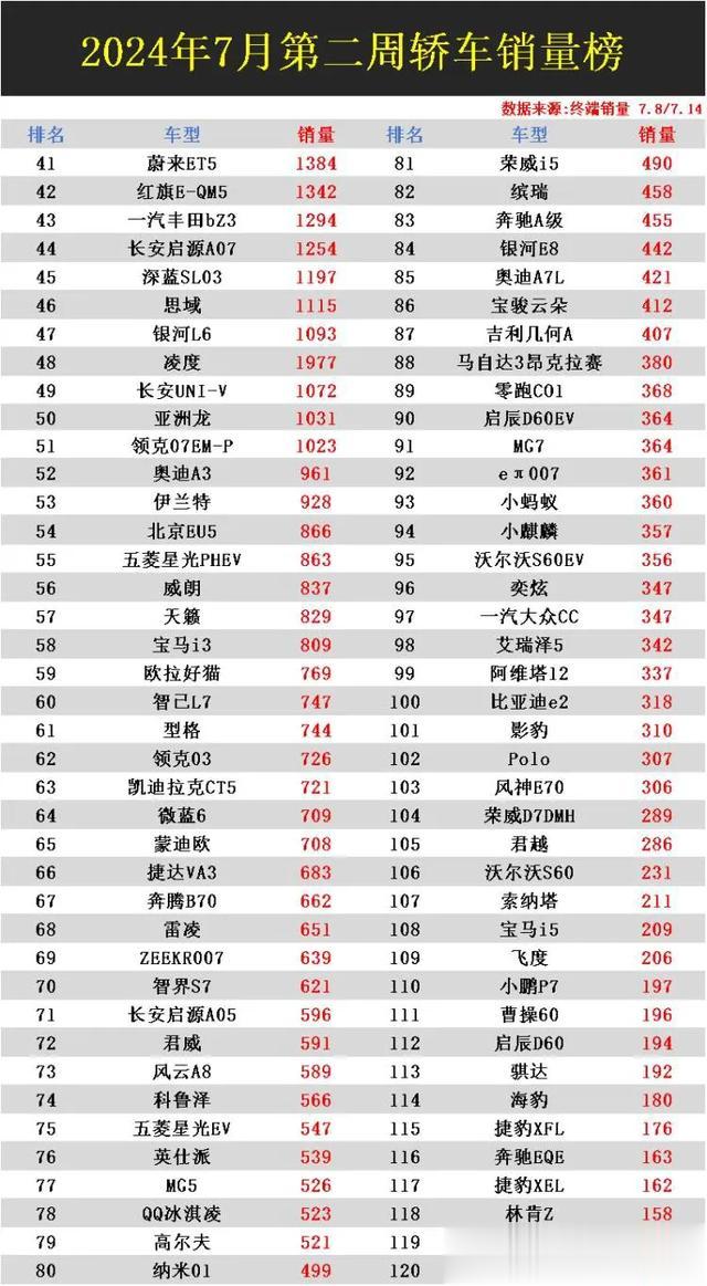 导读:如今的车市竞争可谓激烈,轿车销量排行大变天,新能源车强势崛起,力压传统燃油车,轩逸已彻底无缘前三,帕萨特无缘前五,凯美瑞,卡罗拉更无缘前十。2024年7月第二周(7.8/7.14)轿车销量排行榜已正式揭晓,“终端销量”数据显示,共有7款车型超4000辆,海鸥蝉联冠军,秦LDM荣获亚军,朗逸季军,秦PLUSDM,轩逸都进前五名,海豹06DM,帕萨特,秦PLUSEV,驱逐渐05,宏光MIN EV均入围榜单前十,反观小米SU7,表现不及预期,仅排在第23名!