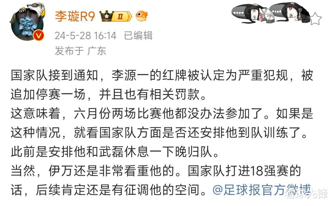 据《足球报》李璇消息,目前中国男足已接到通知,亚足联认定国脚李源一的红牌动作为危险行为,会对泰山国脚追加停赛一场,国足六月份两场比赛李源一将全部缺席,按照国足计划,红牌停赛的李源一将会与黄牌停赛的武磊一同归队,由于伊万非常看重李源一和武磊,两人也被看作国家队决战韩国“王牌”,现在一切只能期待打进18强赛。