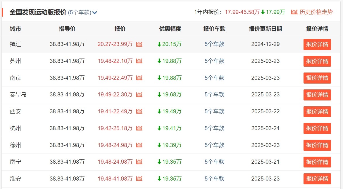 先来看价格,从我们在报价网站上所了解到的信息来看,目前全国各地经销商为路虎发现运动版车型所给出的最低报价为19.41万,终端优惠是19.42万,相当于打了个5折在进行销售。而这也就证明,16.98万的路虎发现运动版现在是没有且买不到的,这点大家一定要知晓。