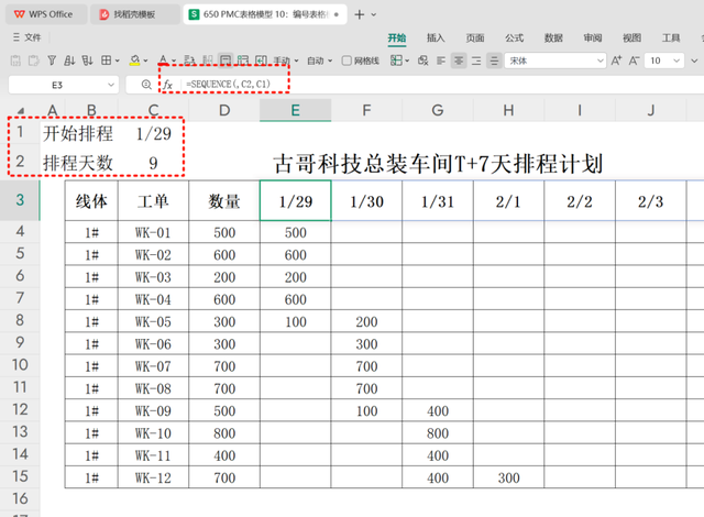 这样,通过上述设置生成的日期序列将根据C1和C2单元格中的值自动调整。只需修改这两个单元格的内容,即可实现日期的自动更新,使生产计划变得更加灵活高效。这种方法不仅减少了手动操作的工作量,还提高了计划调整的准确性和效率。