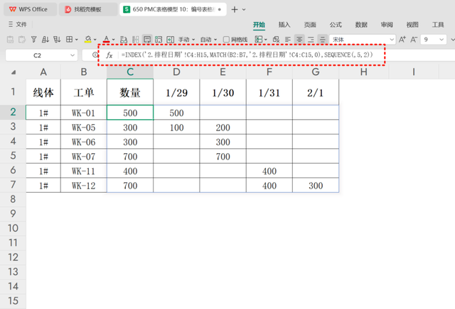 MATCH(B2:B7, '2.排程日期'!C4:C15, 0):用于查找B2到B7范围内工单号在“2.排程日期”工作表C4到C15区域中的位置。MATCH函数返回的是找到的第一个完全匹配项的位置。