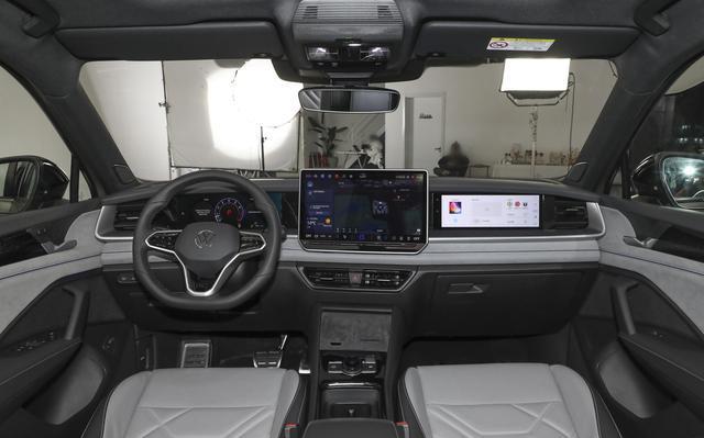 内饰采用大众最新家族式设计风格,配备三幅式多功能方向盘、全液晶仪表盘、悬浮式中控屏、副驾驶娱乐屏和电子怀挡。中控台的层次感颇为鲜明,整体营造出的科技感相当不错。