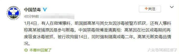 近日,网曝前国脚,那英前男友高峰贩毒被捕 。1月5日,国家禁毒委员会办公室@中国禁毒 证实高峰再度被抓,但对于具体情况作出澄清,表示“高某因在社区戒毒期间再度吸食冰毒被抓,被行政拘留14日,同时强制隔离戒毒二年。高某无贩卖毒品情况。” 高峰最近几年真的是负面新闻不断呀、 #前国脚高峰吸毒被捕#