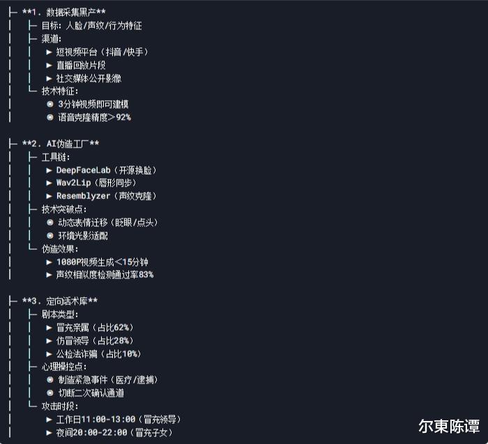 首先,我们得搞清楚AI诈骗的大体流程图,这样才好防范。诈骗分子现在使用的“深度伪造三件套”如下: