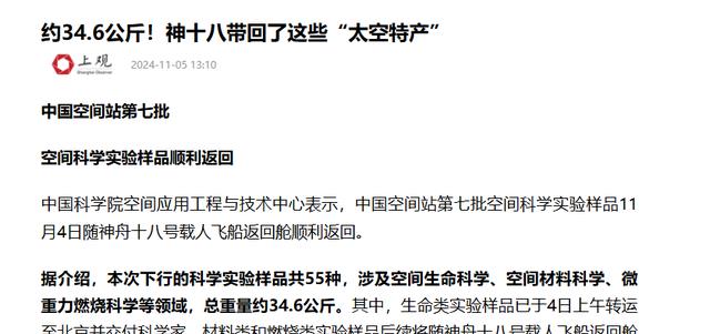 上观新闻————约34.6公斤!神十八带回了这些“太空特产”