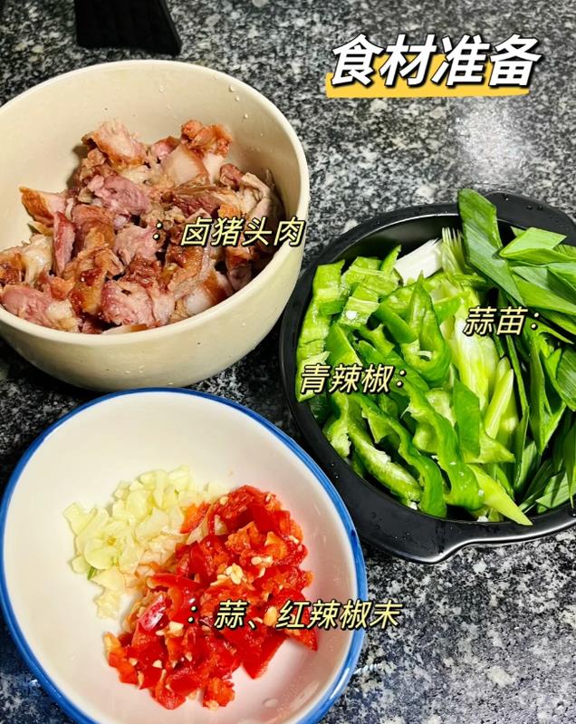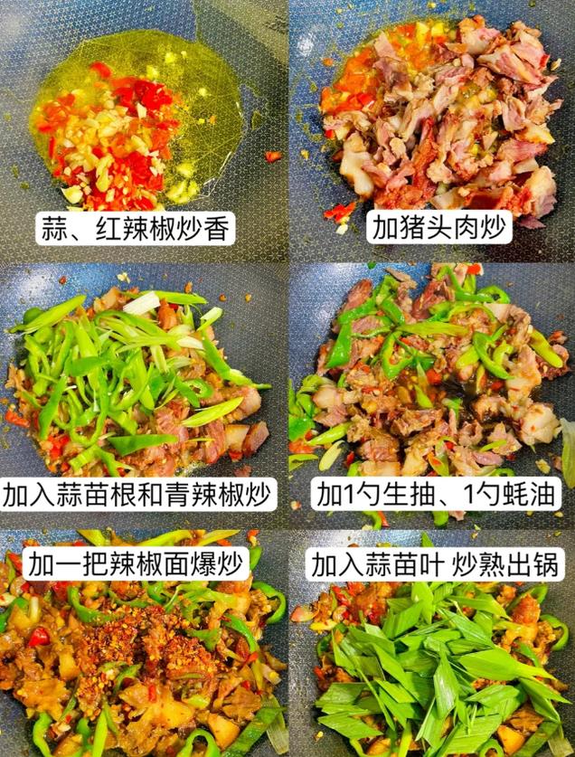 ①油热蒜、红辣椒炒香,加猪头肉炒;