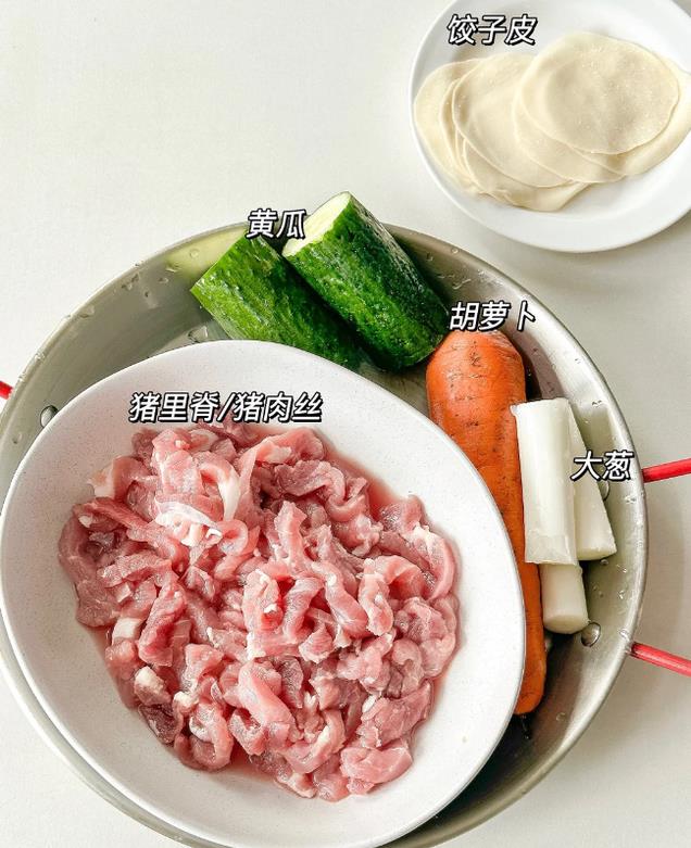 食材:饺子皮15张、猪里脊、黄瓜、胡萝卜、大葱
