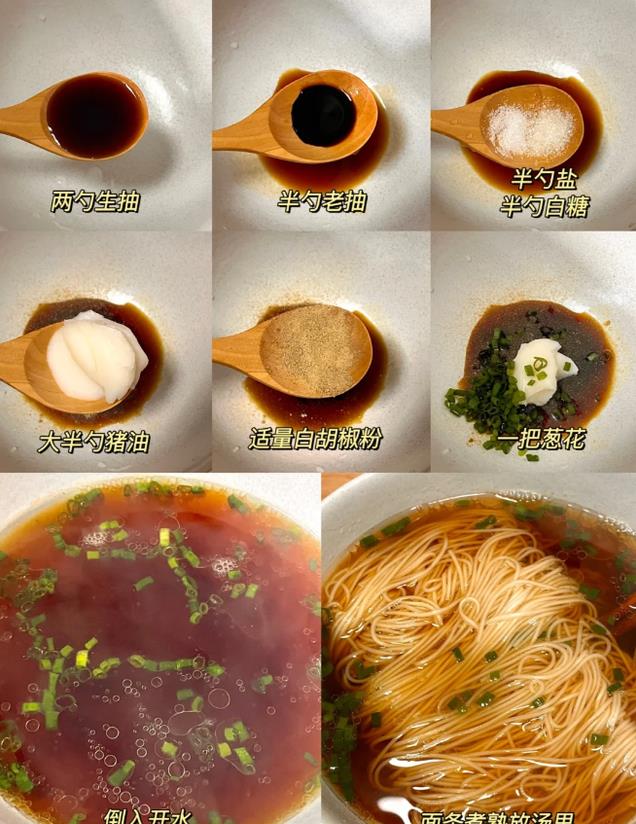 ①碗里加两勺生抽、半勺老抽、半勺盐、半勺白糖、适量白胡椒粉、大半勺猪油、一把葱花。