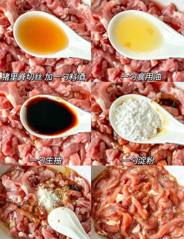 ①猪里脊切丝,料酒、生抽、食用油、淀粉、蛋清抓匀,腌15分钟。