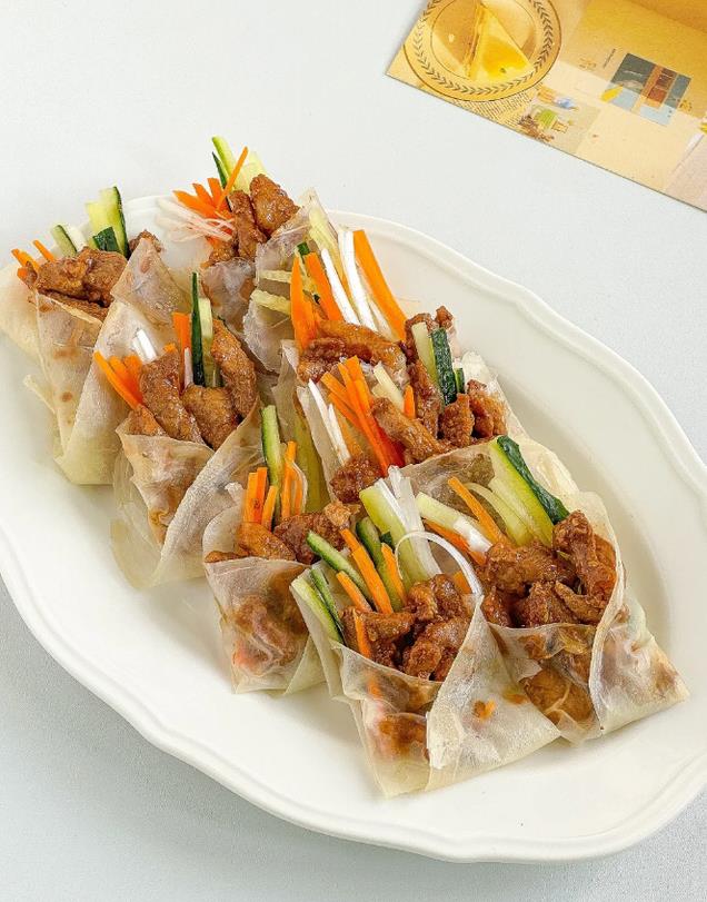 ⑤ 包上胡萝卜丝、黄瓜丝、葱丝,放上京酱肉丝。