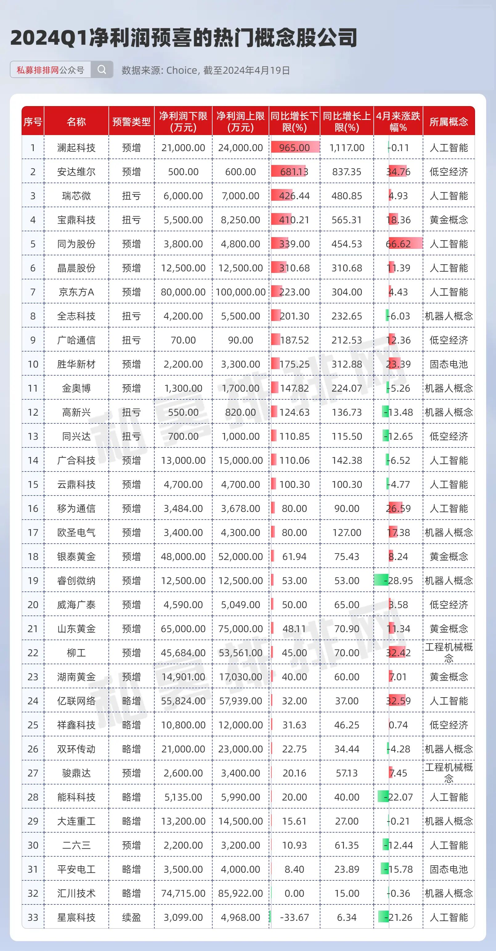 通常而言,上市公司的业绩是投资者评估一家公司投资潜力的关键指标之一。目前,随着一季报预告披露进入高峰期,那些业绩表现出色、迅猛增长的个股尤其值得我们关注。