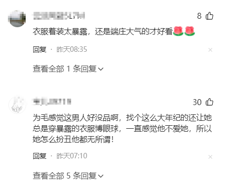 有网友更是吐槽道:“我睡觉都穿不了这样的。”也有的女网友反问道:“真的有老公接受老婆这样穿给大家看吗?”