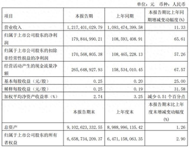 报告期内,基本每股收益0.25元/股,同比减少25%。截至报告期末,公司资产总额为91.03亿元,较期初增长1.26%;归属于上市公司股东的净资产66.59亿元,较期初增长2.90%。