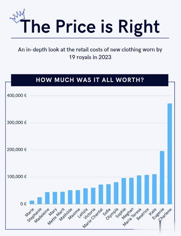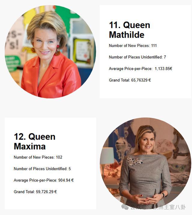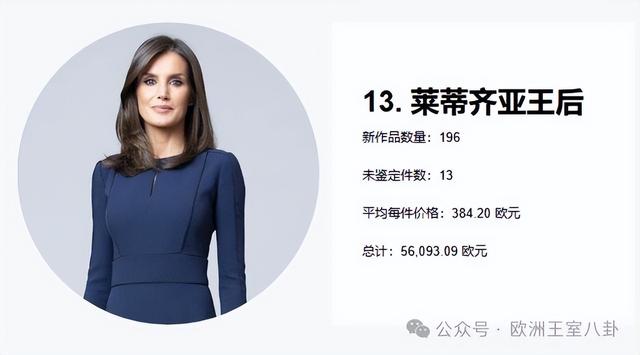 当然拉均价最厉害的还是西班牙王后莱蒂齐亚,在网站统计的女士里面,她买的新品数量最多(196件),均价却是最低(300多欧)